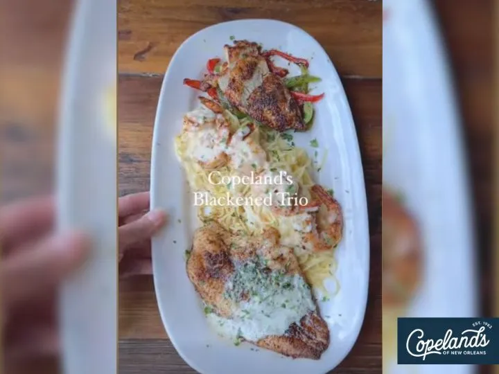 Blackened chicken, Catfish filet, and shrimp served over angel hair pasta and topped with Lemon Bordelaise sauce.