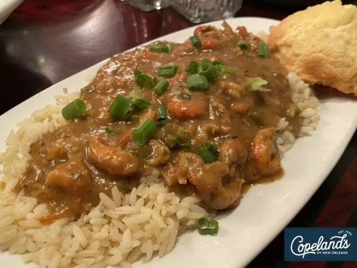 Crawfish in a dark roux-based sauce, garlic, green onions, spices, ladled over steamed rice. Try it with Shrimp!