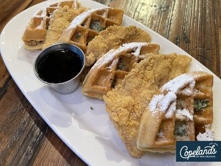 Buttermilk vanilla waffles topped with fried chicken cutlets, maple syrup, garlic butter and powdered sugar