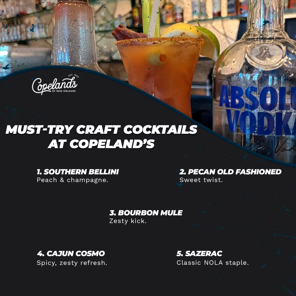 The top craft cocktails to try at Copeland’s are fun, flavorful drinks that mix Southern charm with New Orleans flair. From the peachy Southern Bellini to the nutty Pecan Old Fashioned and the zesty Ginger Mojito, each sip is designed to make your night out feel special. These cocktails aren’t just drinks—they’re part of the vibe, turning your meal into an experience you’ll want to remember.